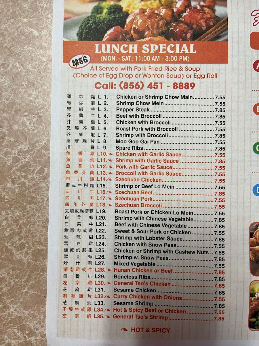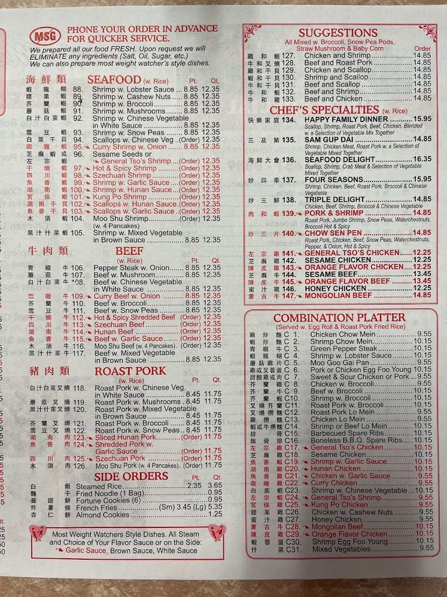 If you prefer vegetarian dishes, options such as Tofu W. Mixed Vegetable and Vegetable Delight are available, offering fresh and light choices. For a seafood fix, the Seafood section includes mouthwatering dishes like Moo Shu Shrimp and Shrimp W. Lobster Sauce, offering a delightful mix of seafood and vibrant Chinese vegetables.