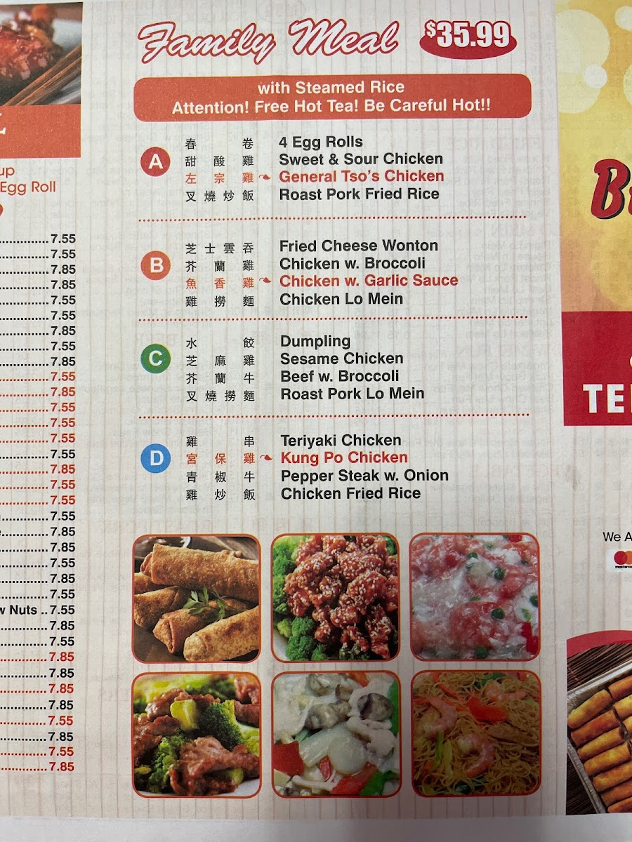 Dumpling, Sesame Chicken, Beef w.Broccoli, Roast Pork Lo Mein