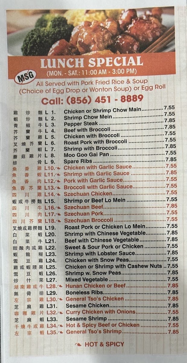 Roast Pork,Jumbo Shrimp,Snow Peas,Waterchestnuts, Broccoli Hot & Spicy